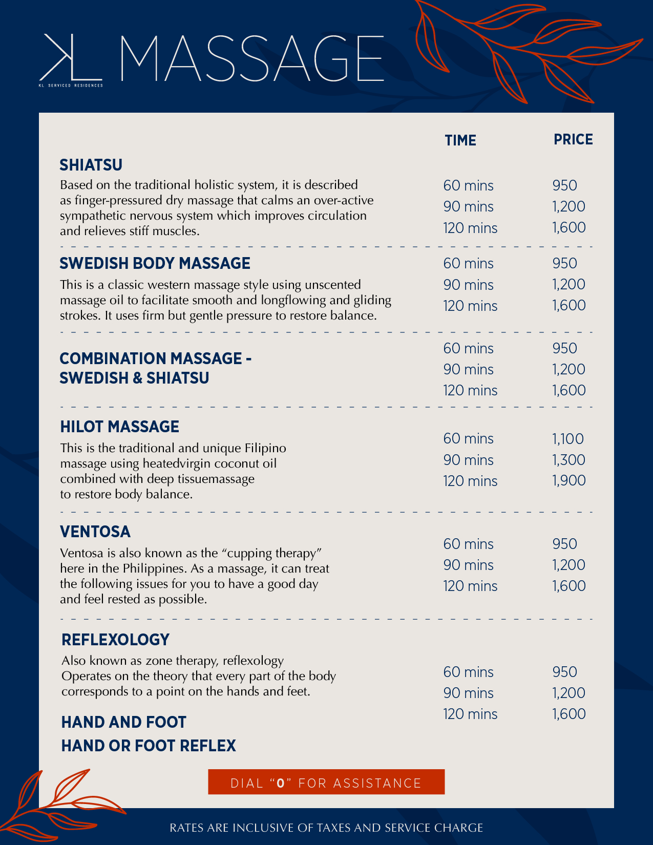 In-room massage services are available by advance booking through the Front Desk. Kindly place your request at least one hour before your preferred schedule.